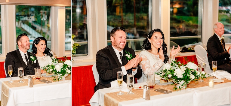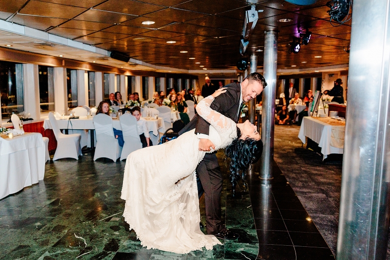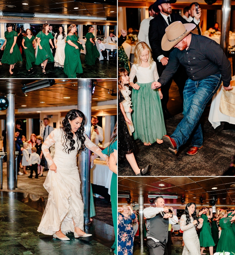 The boat glided gracefully along the Willamette River, treating us to stunning views of the river and the Portland’s skyline. The happy couple’s guests loved the boat ride, and took in the view while eating dinner. The reception featured heartfelt toasts, a piano performance, and Breanne’s bridesmaids line dancing. Every moment of the evening felt like we were a part of something truly special.