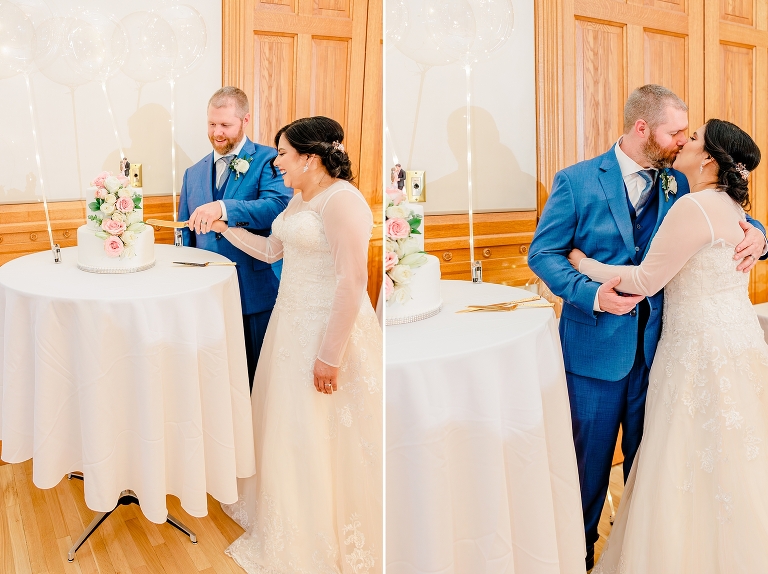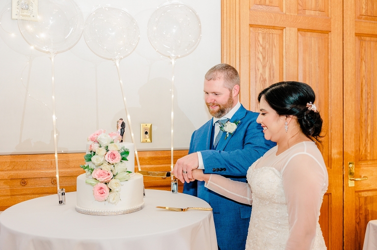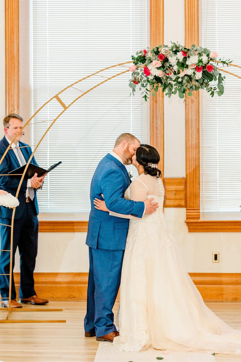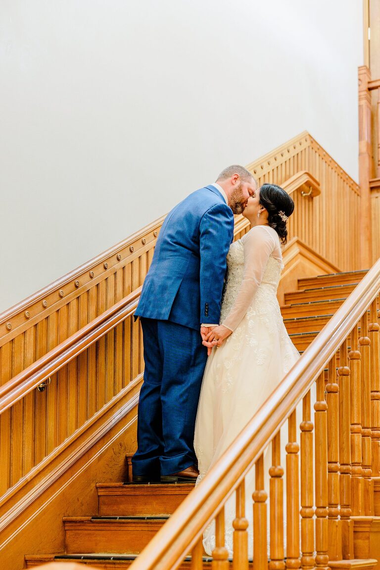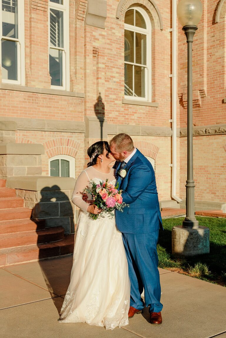 As I first pulled up for Noiralih and Clint’s Provo City Library wedding, I was amazed by the building. Its beauty and intricate architecture are stunning, and the building is reminiscent of a castle. The festivities were held on the third floor in the ballroom. As soon as you walk in, the room is large and grand. Beautiful tables were set up with pink floral centerpieces, gold accents, and it was just so lovely!