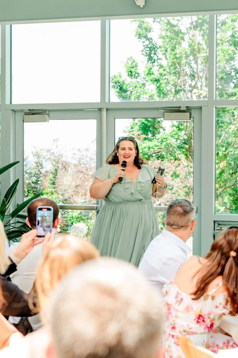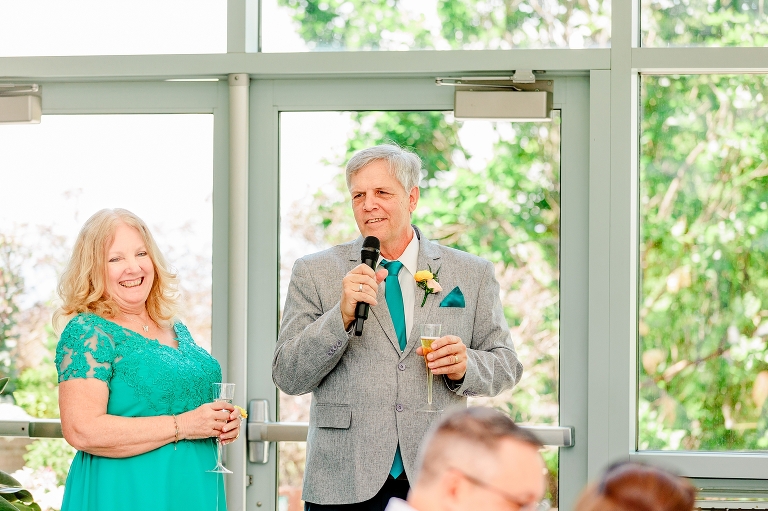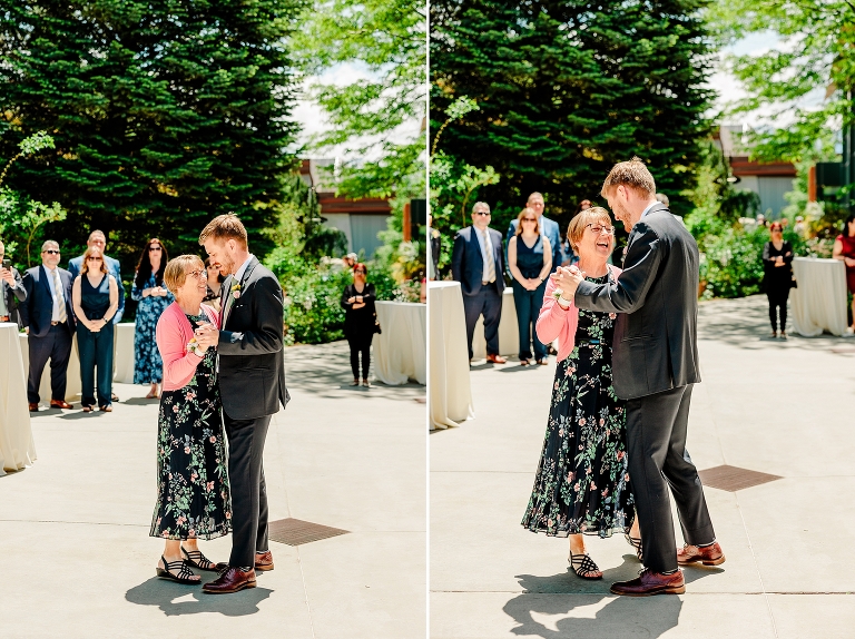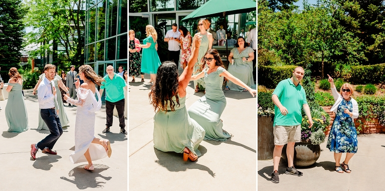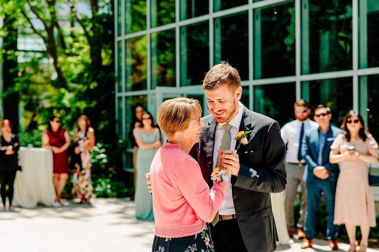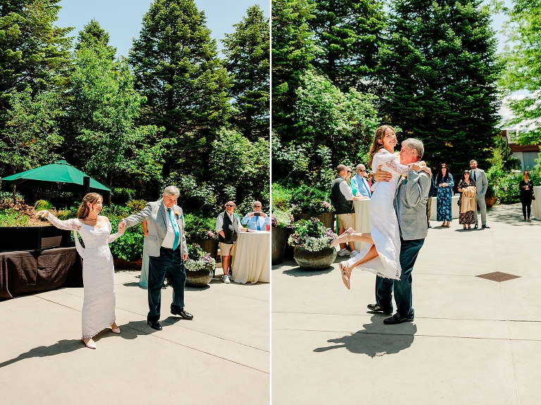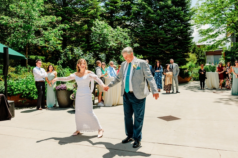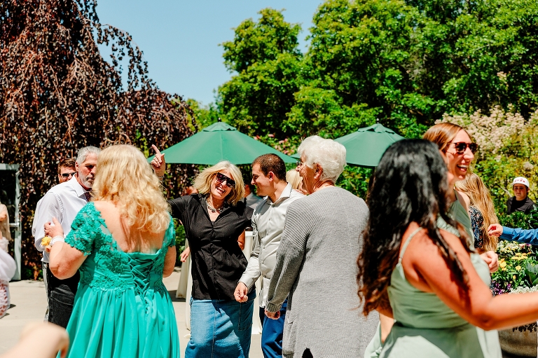 Following the ceremony, the afternoon was full of lovely moments. We heard heartfelt speeches, ate a yummy brunch, and watched Ashley and Joey do a mochi doughnut pull in lieu of cake cutting. Finally, it was time for dancing! Everyone gathered on the patio outside the Orangerie for the couple’s first dance. Ashley and Joey definitely delivered an incredible performance. It was filled with spins, lifts, and sealed with an epic kiss!